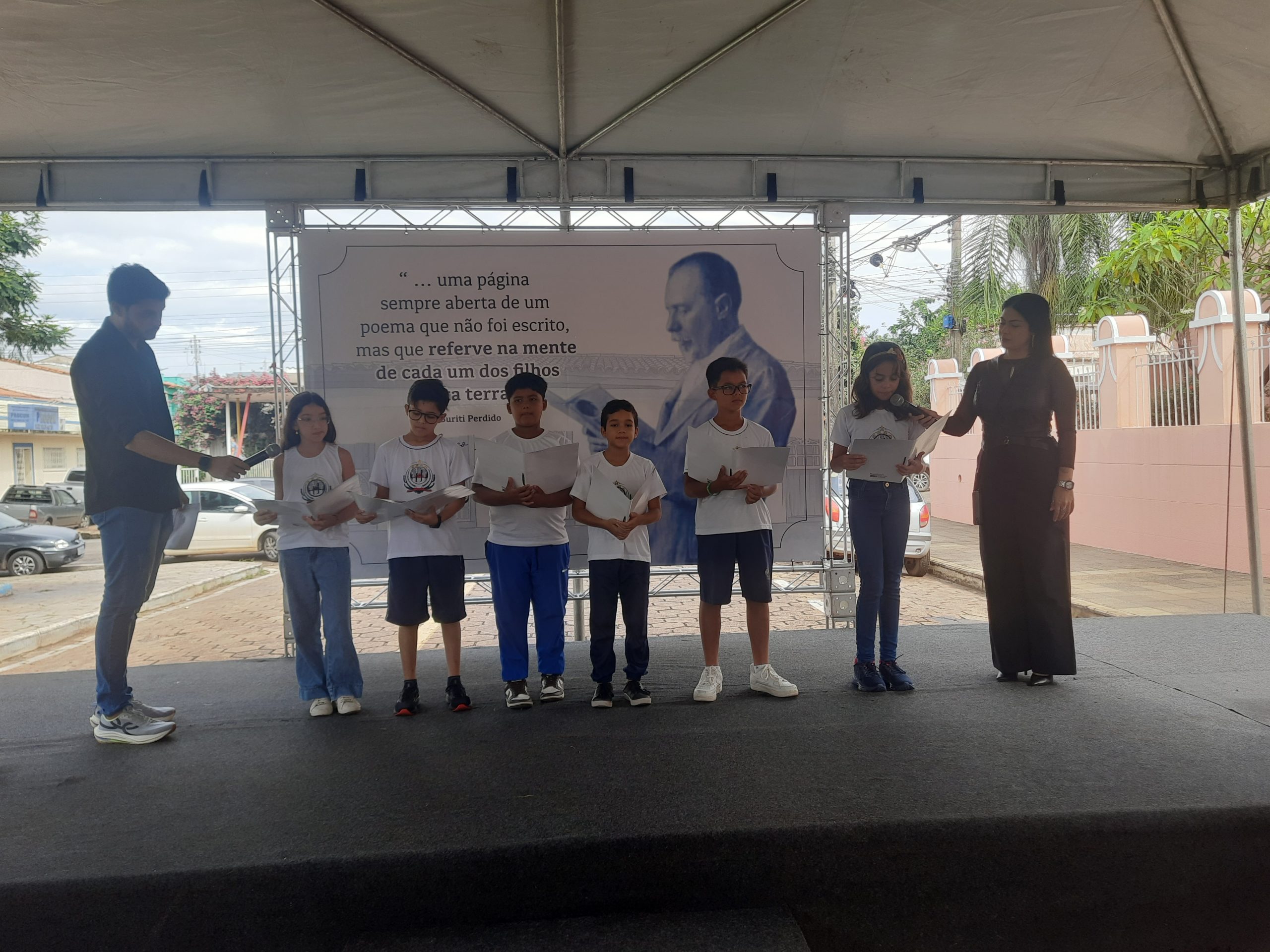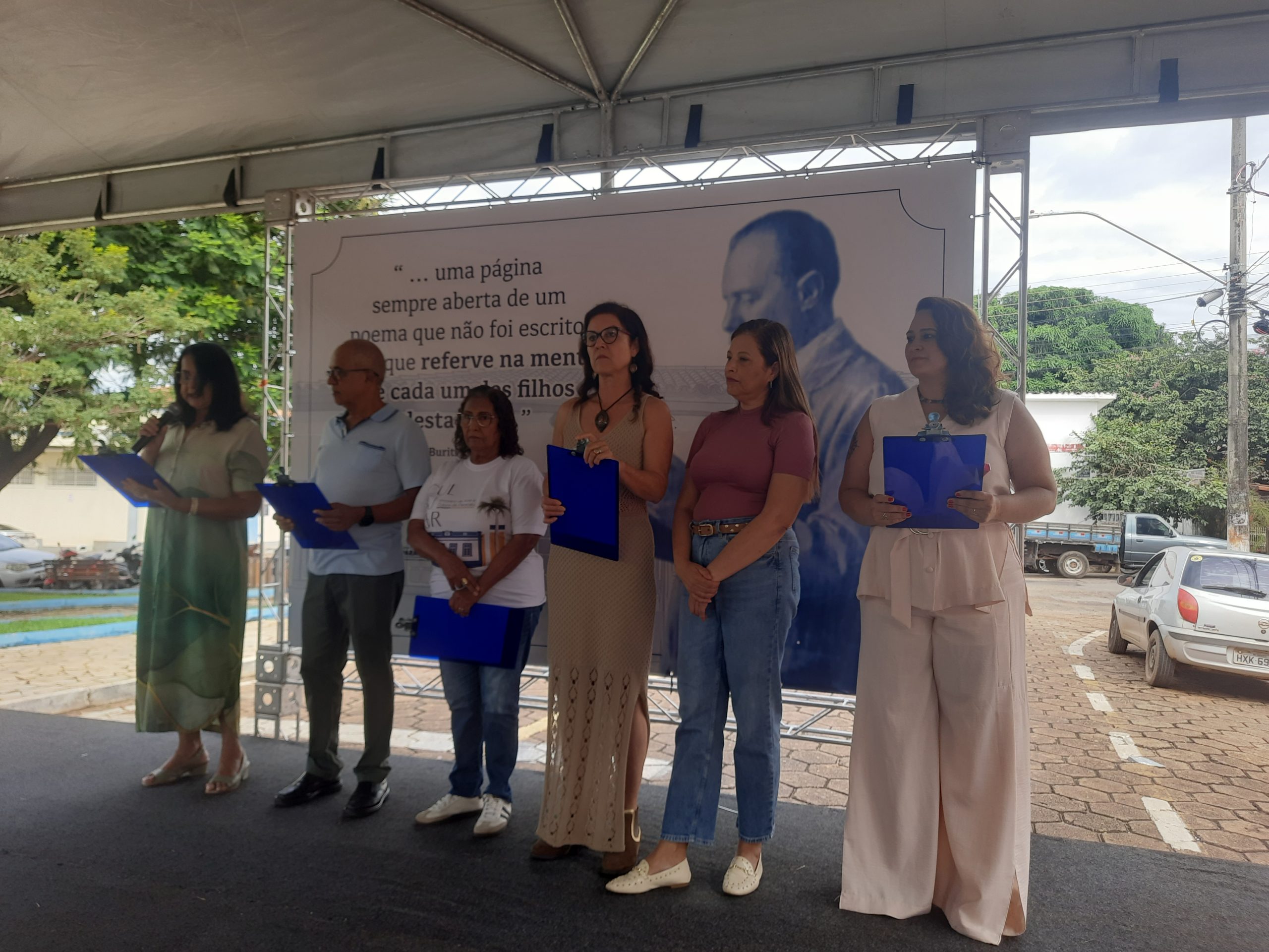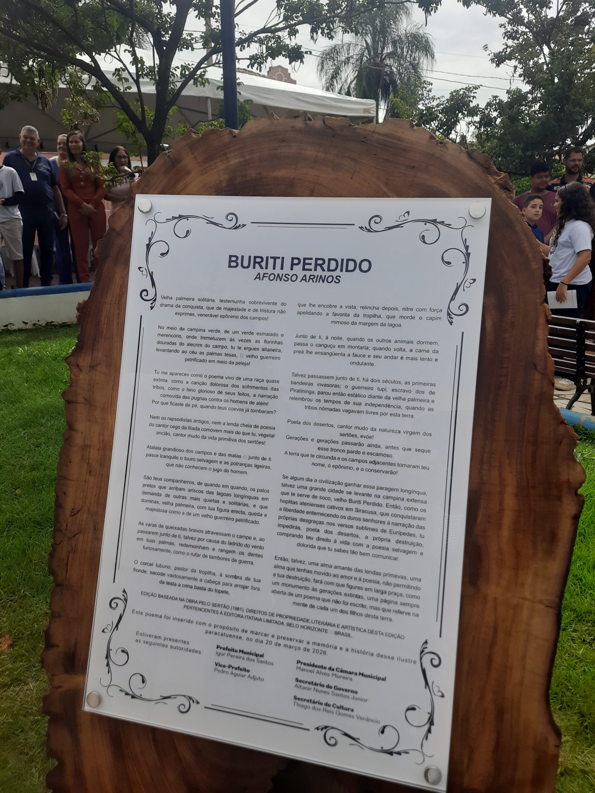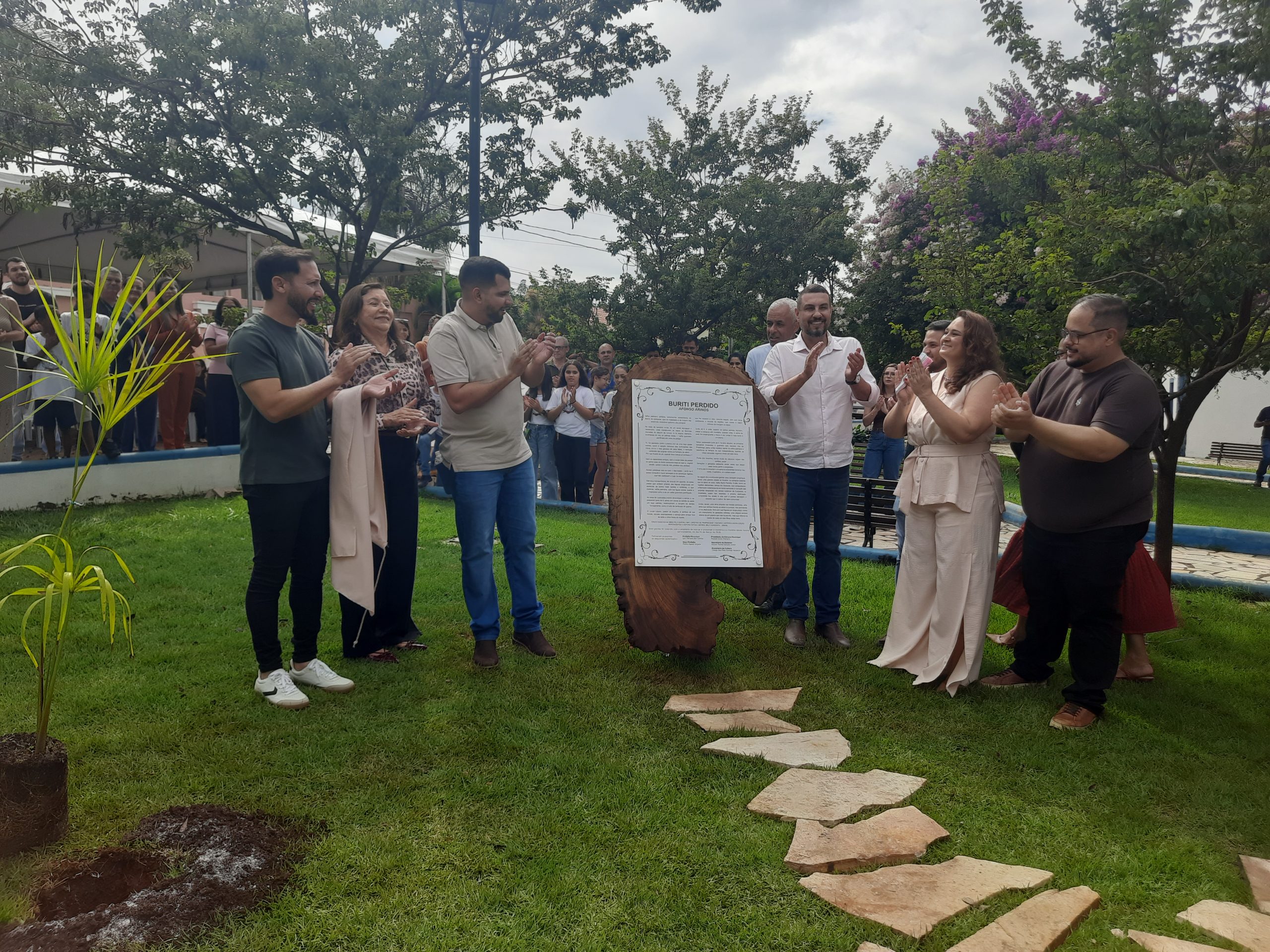 Ao final, sob aplausos e emoção, o prefeito realizou o descerramento do memorial do poema Buriti Perdido. Em seguida, ao lado do aluno Antônio Oliveira, plantou o buriti que agora cresce como símbolo perene.