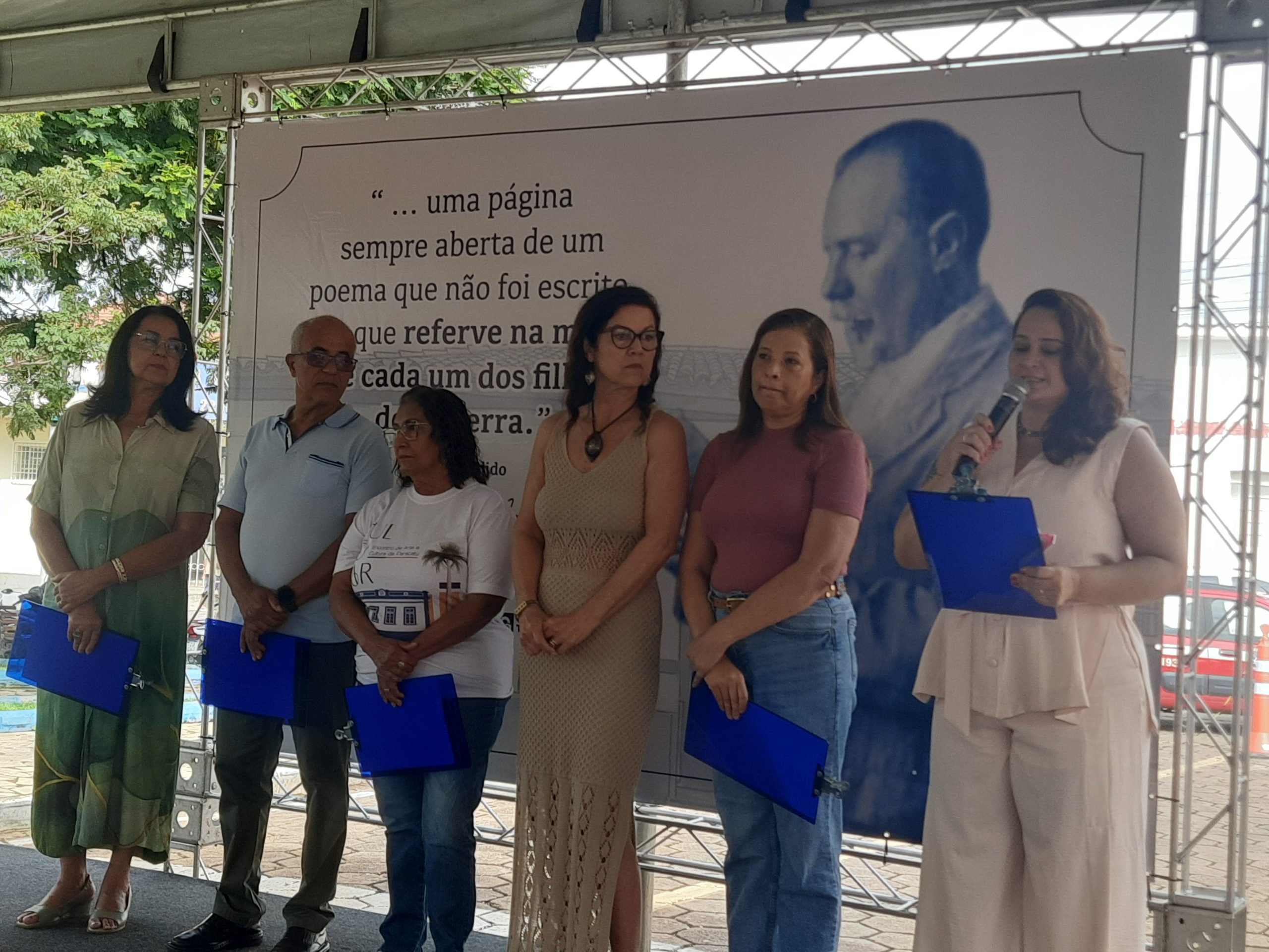 Autoridades locais também participaram do evento, com pronunciamentos do secretário de Cultura, Thiago Venâncio; da diretora da escola, Erci Magalhães; da presidente da Academia de Letras, Daniela Prado; do secretário de Governo, Altanir Júnior; do vice-prefeito, Pedro Adjuto; e do prefeito, Igor Santos.