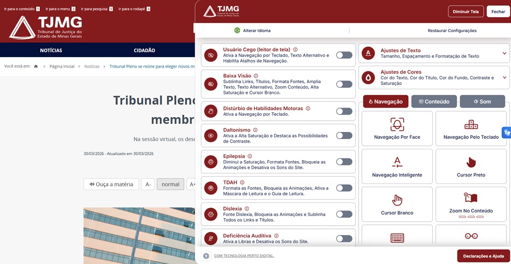 O Tribunal de Justiça de Minas Gerais (TJMG) está lançando mais uma ferramenta de inclusão com soluções que ampliam a acessibilidade digital em seu portal institucional. O foco é na garantia de uma experiência mais democrática e intuitiva para todos os cidadãos, visando à eliminação de barreiras no ambiente virtual. A ferramenta inclui perfis de acessibilidade com configurações pré-definidas – como baixa visão, daltonismo, dislexia, Transtorno do Déficit de Atenção com Hiperatividade (TDAH), epilepsia, cegueira e deficiência auditiva –, além de suporte à Língua Brasileira de Sinais (Libras). Também é possível ajustar contraste (claro, escuro ou invertido), modificar fontes e espaçamentos para facilitar a leitura e utilizar diferentes modos de navegação, inclusive por teclado. Outros recursos contemplam as tecnologias assistivas, como leitor de texto por voz, comando de voz, teclado virtual e até navegação por rastreamento facial via webcam. Há ainda opções para bloquear animações e ocultar imagens, medidas importantes para pessoas com TDAH ou autismo. Segundo a diretora executiva de Logística e Sustentabilidade do TJMG, Selmara Alves Fernandes, a importância da acessibilidade digital reside na humanização da tecnologia: “Ao investir nessa ferramenta, o TJMG assegura que a modernização digital não se torne uma nova forma de exclusão, mas sim um caminho para uma Justiça mais célere, transparente e, acima de tudo, acessível a cada mineiro.” Por meio de um plugin de acessibilidade digital, com mais de 60 funcionalidades, o Portal do TJMG propicia uma experiência mais democrática e intuitiva para todos os cidadãos (Crédito: TJMG / Divulgação) O analista de Sucesso do Cliente da Perto Digital, Eduardo Rauber, explica que a implementação não exige mudanças estruturais no site, que mantém seu layout atual. Um ícone de acessibilidade foi adicionado às páginas, do lado direito, permitindo o acesso rápido a uma barra lateral com todas as funcionalidades. Ele destaca que a empresa é dedicada a eliminar barreiras de acesso em ambientes virtuais: “Nosso trabalho se fundamenta na aplicação de práticas nacionais e internacionais de acessibilidade para o mundo digital, assegurando que conteúdos web sejam perceptíveis, operáveis e compreensíveis para todas as pessoas, incluindo aquelas com deficiências permanentes, temporárias ou situacionais.” Diretoria Executiva de Comunicação – Dircom |